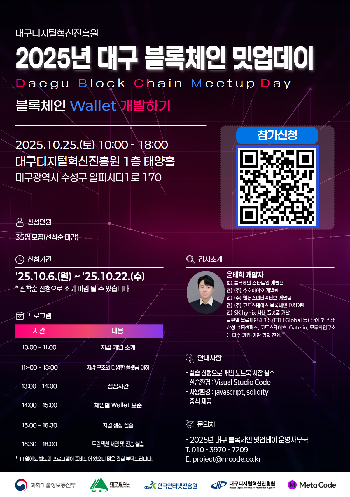 과학기술정보통신부와 한국인터넷진흥원이 주관하고, 대구광역시와 대구디지털혁신진흥원이 함께하는 「2025년 대구 블록체인 밋업데이」에 여러분을 초대합니다.